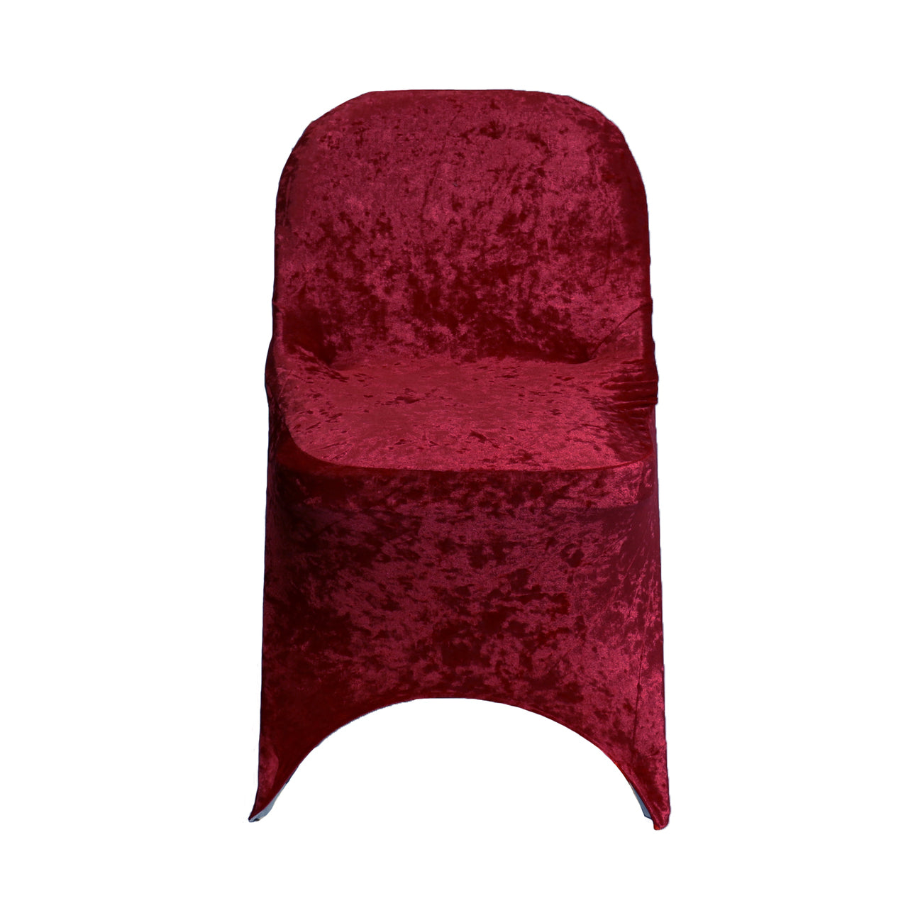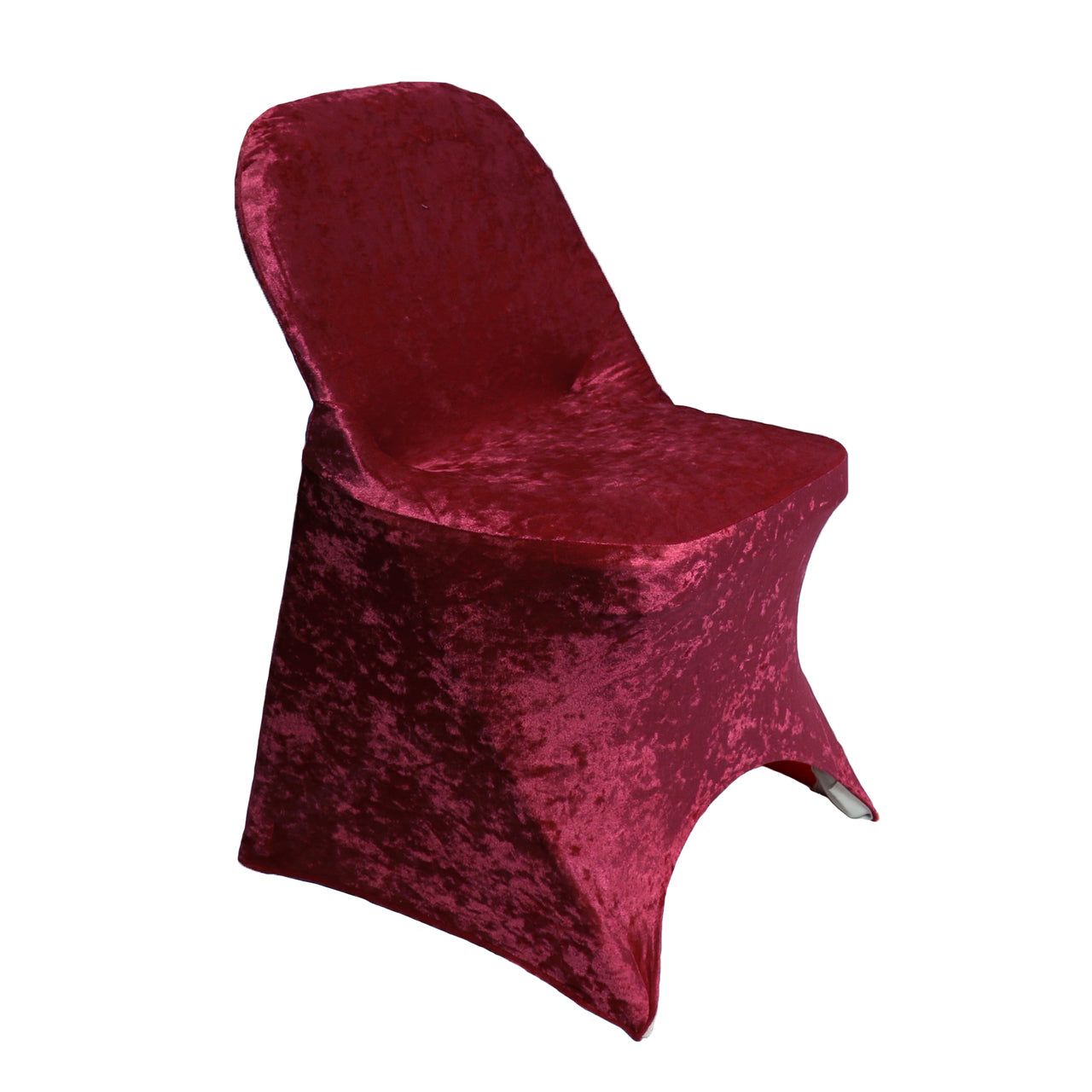 Made from high-quality stretch velvet spandex material, our burgundy stretch velvet spandex folding chair covers exemplify modern sophistication and luxurious elegance and are designed to fit standard folding chairs at weddings, casinos, hotels, restaurants, and other special events. Burgundy velvet spandex chair covers from Bridal Tablecloths have deep canvas foot pockets, are durable, do not require ironing, and can be laundered countless times. There are cheaper versions of this material available in the market, ours is crafted from a hotel and restaurant quality velvet spandex type of material.