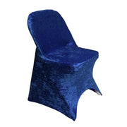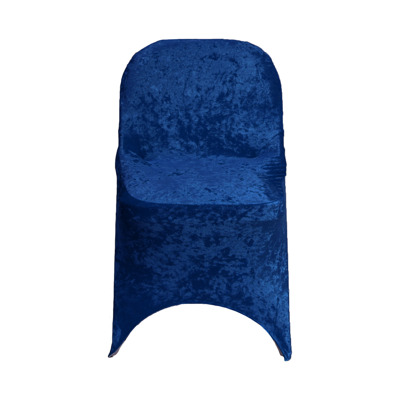 Made from high-quality stretch velvet spandex material, our navy blue stretch velvet spandex folding chair covers exemplify modern sophistication and luxurious elegance and are designed to fit standard folding chairs at weddings, casinos, hotels, restaurants, and other special events. Navy Blue velvet spandex chair covers from Bridal Tablecloths have deep canvas foot pockets, are durable, do not require ironing, and can be laundered countless times. There are cheaper versions of this material available in the market, ours is crafted from a hotel and restaurant quality velvet spandex type of material.